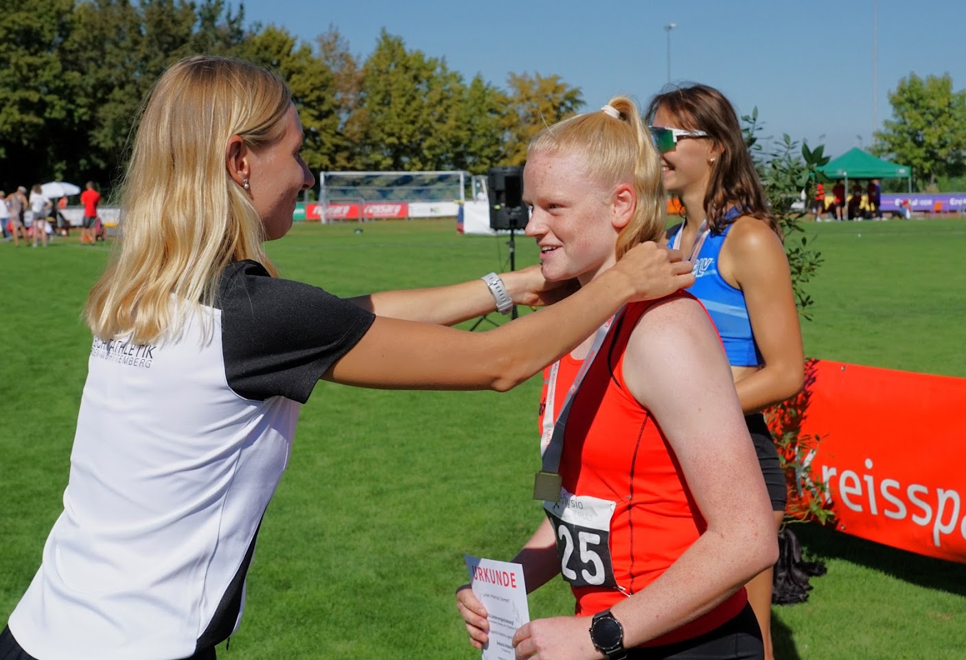 Der dritte Sieg hintereinander für die favorisierten Bayern war bei 223 Punkten zwar nicht zu verhindern, doch dahinter konnten Württemberg mit 191 und auch Hessen mit 166 Punkten den Abstand wieder verkürzen und für den einen oder anderen Überraschungserfolg sorgen. So konnte Antonia Heberle (TV Rottenburg) mit 13,82 Meter im Kugelstoßen das Duell mit der deutschen Meisterin Chiara Wildner (Bayern) für sich entscheiden und wurde dafür von Landrat Bläse ebenso mit dem Preis für die beste Tagesleistung im WLV-Team ausgezeichnet wie Lukas Melzer (LG Teck), der im nach Heidenheim ausgelagerten Hammerwerfen mit 55,54 Meter seinen bayerischen Konkurrenten knapp distanzierte. Mit ihren Leistungen rückten Heberle und Melzer jeweils auf Rang zwei der deutschen Bestenliste vor. Schon ein Indiz dafür, dass im Essinger Schönbrunnenstadion ein großer Teil der deutschen Nachwuchs-Elite am Start war.